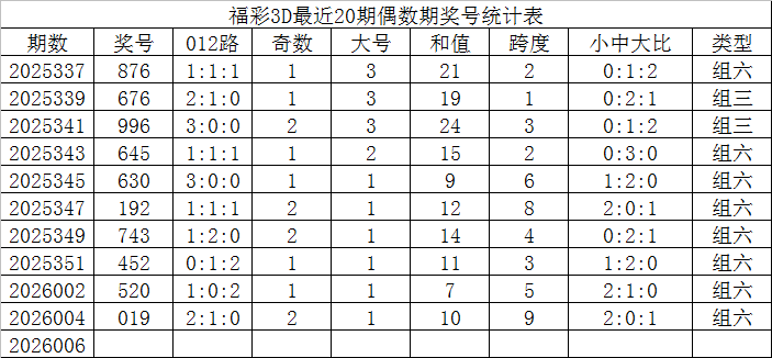 福彩3D最近20期偶数期奖号为: