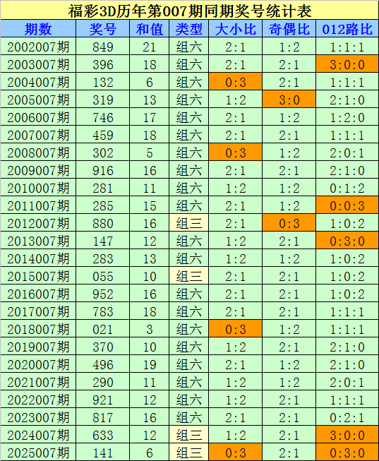 组选类型判断:在第007期历史同期开奖中,组六开出20次,组三开出4次,今年同期看好开出组六号码。