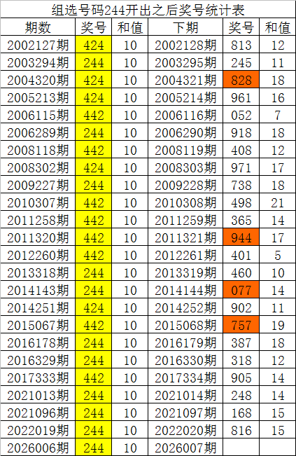 福彩3D第2026006期开出直选号码为:244,该直选号码历史上出现了11次,其下期分别开出了号码:245、918、738、460、077、387、318、248、168、816,如图: