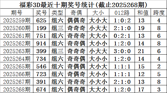 开奖回顾:福彩3D第2025268期奖号为674,奖号形态为:组六、大大小、1:2:0、偶奇偶。