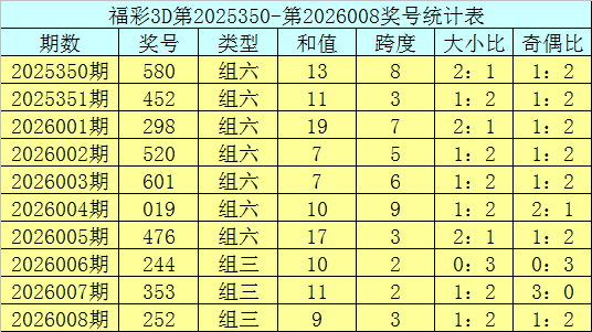 类型判断:上期奖号为252。号码2近10期出现6次,走热,号码出现频次较高,上期各位号码总体较热,本期关注温码开出。