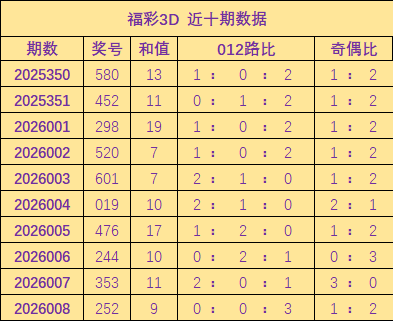 开奖回顾:福彩3D上期奖号为252,其中奖号012路比为0:0:3,和值为9,奇偶比1:2。