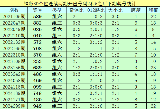 个位号码:最近两期个位开出号码为2-5,在福彩3D历史开奖中,前后两期个位分别开出号码2-5的奖号出现了82次。最近15期个位2-5组合出现之后,其下期奖号分别为:589-882-026-040-572-708-370-253-689-486-469-099-748-480-949;