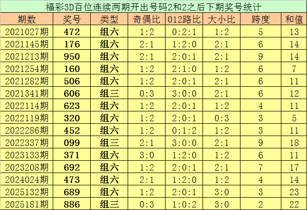 百位号码:连续两期百位出号分别为:2-2,历史上福彩3D连续两期前后分别出号2-2的奖号共出现77次。在百位2-2的奖号现象出现时,近15期下期分别出号:472-176-950-160-506-606-623-320-452-099-371-692-473-689-886;