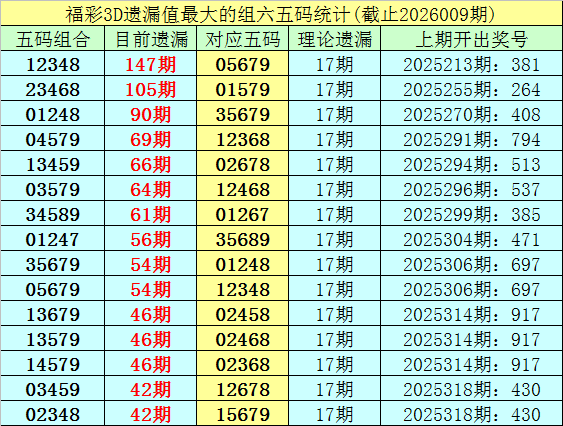 4.截止第26009期,五码组六遗漏最大的是:12348,当前遗漏147期。短期解冻的可能性较小,则26010期奖号分布在12348-05679之中的可能性最大。