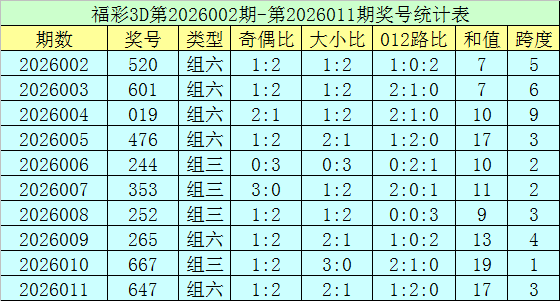 上期回顾:福彩3D第2026011期开奖号码为647,组选类型为组六,奇偶比为1:2,大小比为2:1。