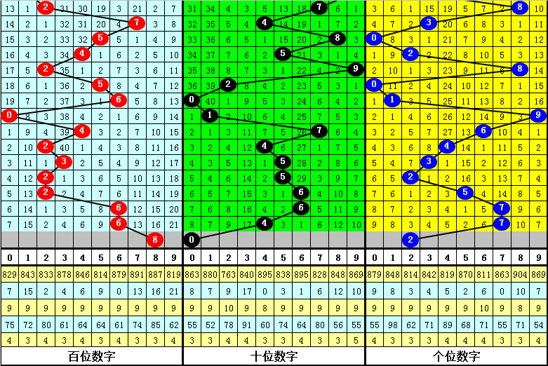 百个位合:前10期百个位两码合开出:5、7、9、0、6、6、4、7、3、3,其中百个位两码合012路比为6:3:1,奇偶比为6:4,本期参考百个位两码合开出偶数,两码合关注0、4、8。