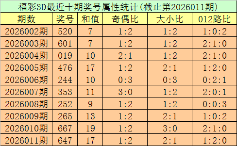 开奖回顾:第2026011期福彩3D奖号为647。奖号形态为组六,大小比为2:1,和值为17,奇偶比为1:2,012路比为1:2:0,跨度为3。