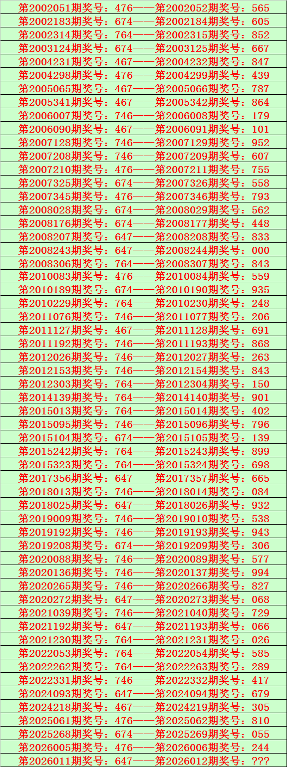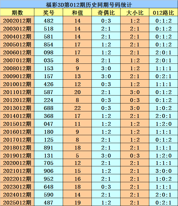 福彩3D第2026012期开奖日期:2026年1月12日,历史上第012期已开出了24次奖号,历年同期号码分别为:482、518、581、854、098、035、153、157、426、587、224、688、368、047、180、125、891、131、705、906、952、648、590、487。