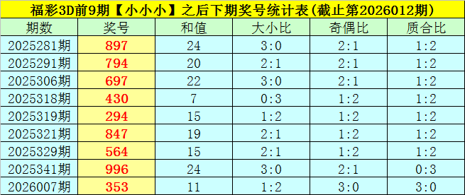 一、上期回顾:福彩3D第2026012期奖号为:241,奖号类型开出组六,大小比为0:3,奇偶比为1:2,和值为7,跨度为3,012路比为0:2:1。