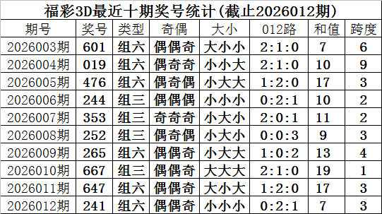 开奖回顾:福彩3D第2026012期奖号为241,奖号形态为:组六、小小小、0:2:1、偶偶奇。