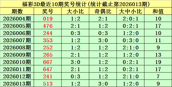 开奖回顾:福彩3D第2026013期奖号为:513。奖号类型为组六,和值为9,奇偶比为3:0,跨度为4,012路比为1:1:1,大小比为1:2。
