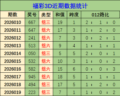 类型分析:上期开出中奖号是223,开出组三类型,最近十期开出组六类型奖6期,分别开出647、241、513、532、582、945。开出组三类型3期,开出667、050、494、223,综合分析,本期预测开出组六号码机率较大。