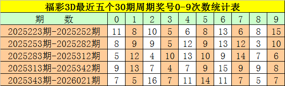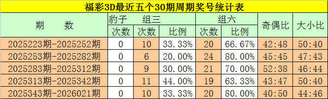 在最近一个30期周期内(第2025343期-第2026021期),豹子奖号没有出现,组三奖号开出了10次,所占比例为40%,组六奖号共出现20期,开出比例为80%,组六号码轮空4期,本期重点关注组六号码出现。