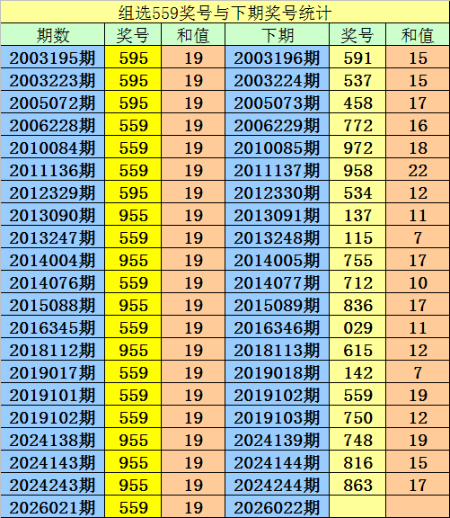 第2026021期3D奖号组选为:559,历史上该号码组选出现21次,下期号码分别为:591、537、458、772、972、958、534、137、115、755、712、836、029、615、142、559、750、748、816、863。