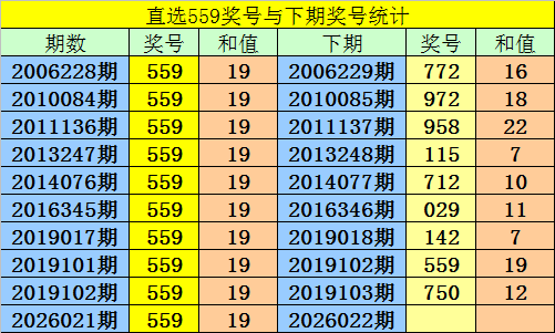 第2026021期3D奖号为:559,历史上该号码直选开出10次,下期号码分别为:772、972、958、115、712、029、142、559、750。