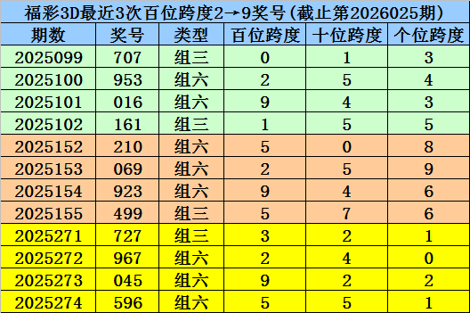 第2025271-第2025273期奖号:727、967、045,其下期奖号为:596,首位号码跨度为5;