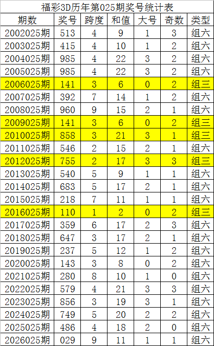 从以上统计可以看出,历年3D第026期开出了9次组三号码,开出了15次组六号码。组三号码和组六号码基本相当,本期预计开出组六号码。
