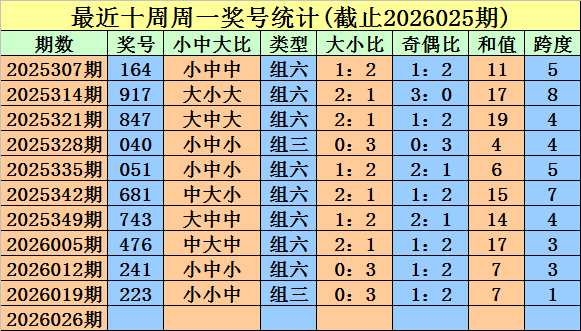 奖号类型判断:近期周一组六明显活跃,近十周开出8次,当前轮空1周,组三出现较少,本周一看好在组六。