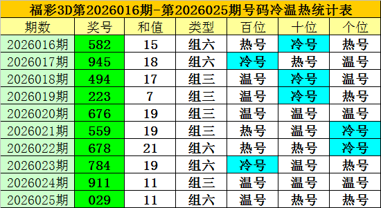 上期回顾:福彩3D第2026025期开奖奖号为:029,奖号类型为:组六,奖号冷温热态为:温号+热号+热号。