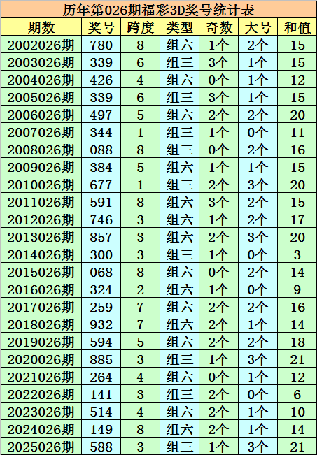 历年第026期福彩3D同期奖号为:780 - 339 - 426 - 339 - 497 - 344 - 088 - 384 - 677 - 591 - 746 - 857 - 300 - 068 - 324 - 259 - 932 - 594 - 885 - 264 - 141 - 514 - 149 - 588。