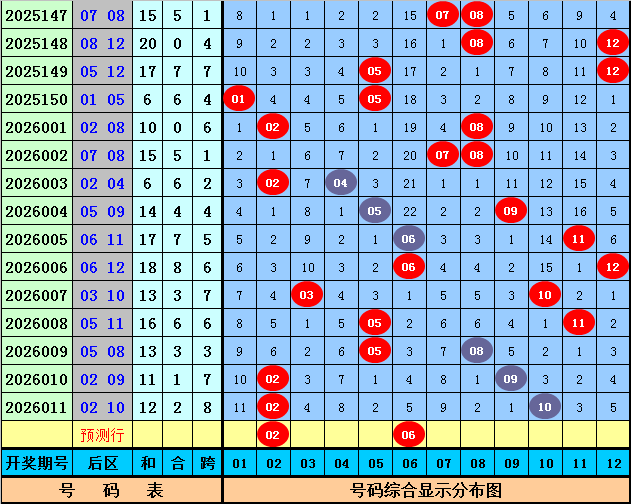 后区分析:在第012期历史同期开奖中,和值大小为10:9,跨度奇偶比为11:8,本期后区注意两码02和06。