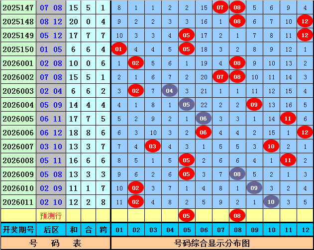 后区分析:上期后区开出号码02和10,最近10期后区奖号奇偶比为9:11,大小比为10:10,本期后区看好号码02、05、08、09、10,后区单挑两码05、08。