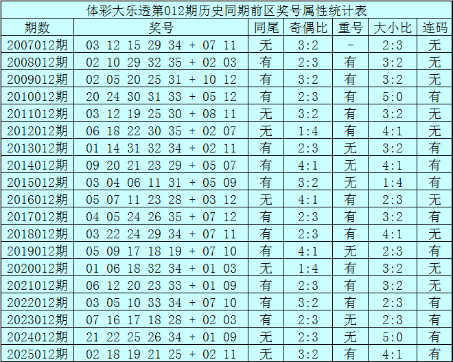 体彩大乐透第012期历史同期开出19次奖号,其统计详见下表: