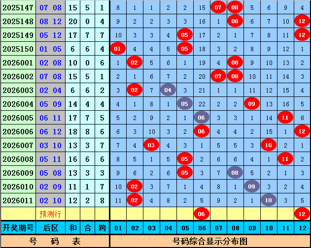 后区分析:上期后区开出号码02和10,在最近15期开奖中,后区奖号奇偶比为13:17,大小比为16:14,本期后区关注一大一小组合和全偶组合,精选两码06和12。