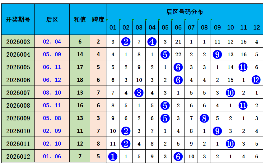 近10期开出0路号码7枚,1路号码4枚,2路号码9枚;上期开出1路号码01、0路号码06。结合分析,本期关注0路、2路号码热出,后区两码参考:02、12。