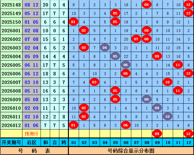 后区第二位:上期该位开出号码06,为遗漏5期的温码,前7期该位分别遗漏:6期、15期、2期、6期、5期、3期、5期,其中冷温热号码个数比为1:4:2,温码表现活跃,本期注意再出温码,参考号码12。