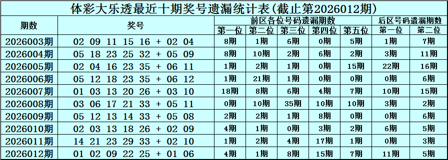 第2026012期奖号:01 02 09 22 25 + 01 06 ,各位号码遗漏期数为:4期、1期、8期、15期、7期 + 11期、5期。