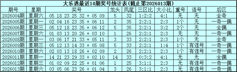 大乐透第2026013期奖号为:03、05、06、23、26+01、04。其中前区三区比为3:1:1,大小比为2:3,没有出现重号,包含连号,后区为一奇一偶号码。