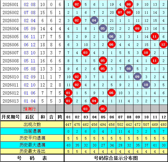 石浩第2026014期大乐透后区分析:后区上周星期一后区奖号为02和10,上期开出奖号01和04,最近9周星期一与最近9期后区奖号奇偶比分别为9:9和8:10,大小比分别为10:8和7:11,本期预计后区开出全奇组合,参考号码03、05、07、11。
