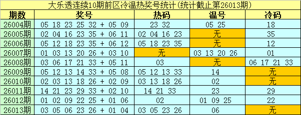 大乐透第26004期-第26013期前区奖号冷温热分布统计: