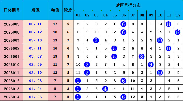上期后区开出号码01 06,和值7,近十期和值17 18 13 16 13 11 12 7 5 7,和值波动范围较大,本期预测和值会上升,重点关注号码:04 10,和值14。