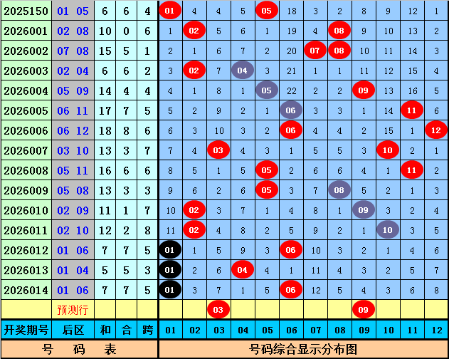 后区号码分析:第015期历史同期开奖中,后区两码全小开出5次,一大一小开出11次,全大开出3次,本期后区预计出现一大一小奖号,参考号码03、09、10、12。