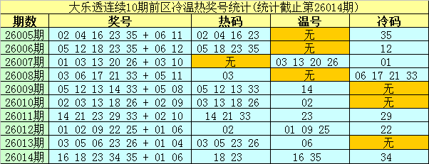 前区温码最近3期开出6个,本期看好前区以热码和冷码为主,排除温码奖号。