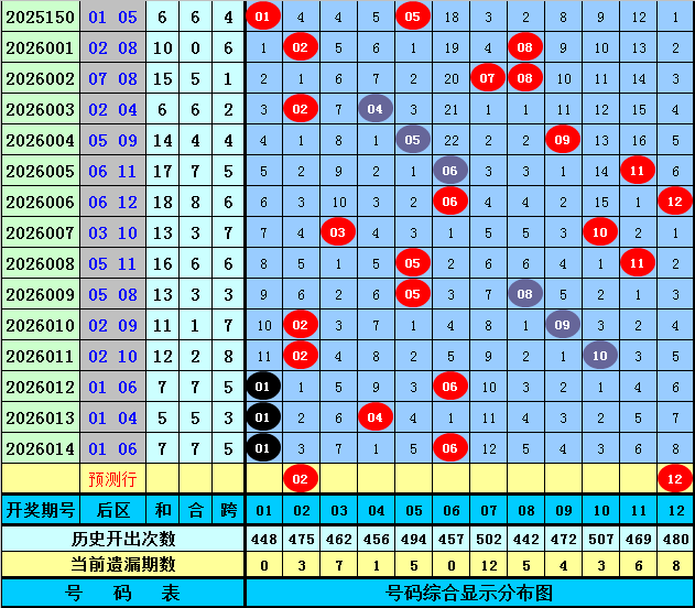 后区分析【一区01-04,二区05-08,三区09-12】:上期后区奖号为01和06,分别落在第一、二区,近50期后区三区比为30:41:29,近10期三区比为7:7:6,本期注意第一、三区号码出现,关注两码02+12。