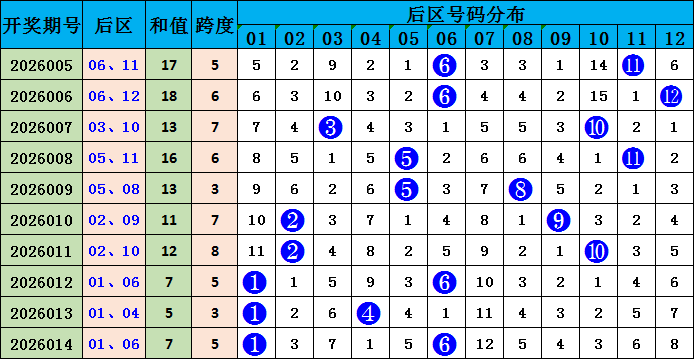 后区分析:大乐透后区上期开出奇偶组合,跨度5。近10期后区奇偶组合出现5期,偶奇组合出现2期,奇奇组合出现1期,偶偶组合出现2期;近10期后区两码跨度1-5开出5次,6-11开出5次,本期后区两码综合推荐:01、09。