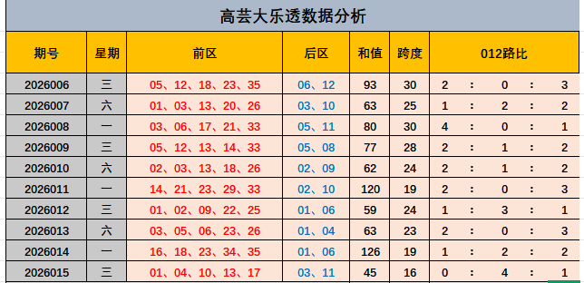 大乐透2026015期开奖奖号前区01,04,10,13,17。后区03,11,前区和值45,跨度16,012路比0:4:1