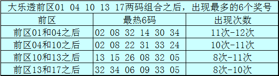 前区两码01和04和之后表现最热的6个号码为:02、08、32、14、30、34;