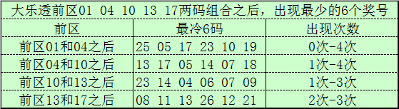 前区两码01和04开出之后,表现最冷的6个号码为:25、05、17、23、10、19;