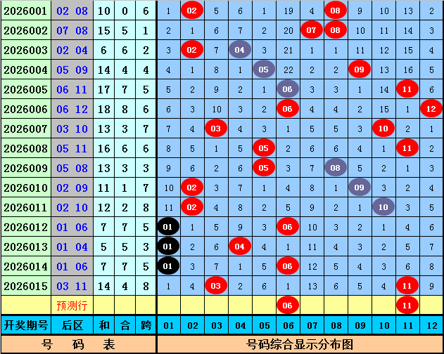 后区上期开出奖号03和11,该组合历史上出现了42次,其下期奖号频次分别为:号码12出现10次,04、05、07出现9次,03、06出现8次,08、09出现7次,02出现5次,01、10出现4次,11出现2次,本期后区参考号码06、07、08、11,精选两码06和11。