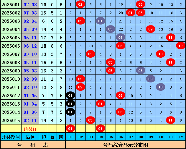 后区分析:上期后区开出0路+2路号03和11,最近30期后区奖号012路比为15:16:29,最近10期后区奖号012路比为7:6:7,本期后区注意号码01、04、06、09、10,单挑两码组合01、04。