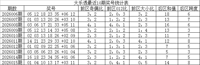 012路分析:上期前区奖号012路比为0:4:1,最近两周2路前区奖号走势较热,0路前区奖号表现较冷。