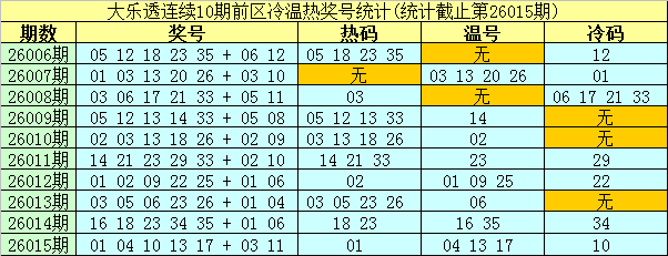 大乐透第26006期-第26015期前区奖号冷温热分布统计:
