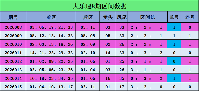上期区间比为3:2:0,上期1、2区势头热,3区比较冷,本期推荐区间比关注2:2:1
