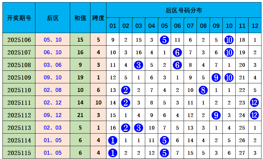 一区(01-12):上期该区开出2个奖号,近10期开出21个奖号,一区落号较高,本期分析该区预计落2个奖号,参考号码为05、12。