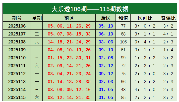 常青大乐透第2025116期本期推荐: